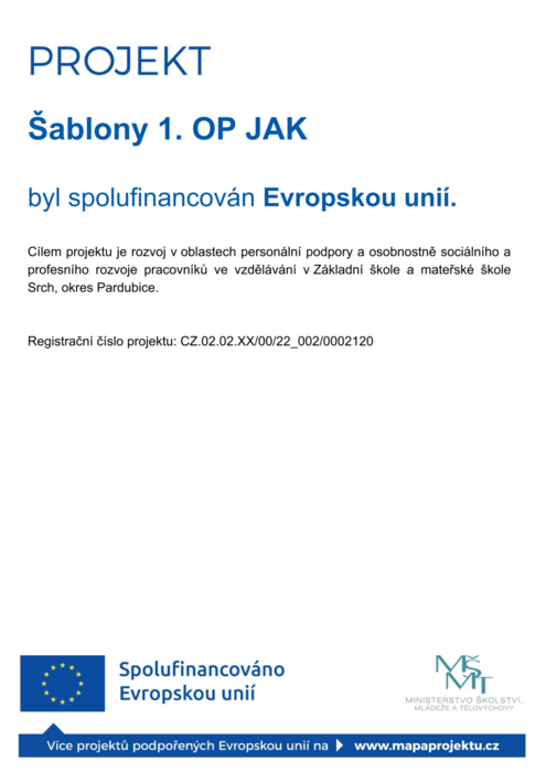 Cílem projektu je rozvoj v oblastech personální podpory a osobnostně sociálního a profesního rozvoje pracovníků ve vzdělávání v Základní škole a mateřské škole Srch, okres Pardubice.